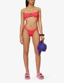 The Hunza G Gloria and Jean Bikini had a baby and the Flora Bikini was born. Moderate adjustable coverage on both top and bottom provides wearability for most. Bow-style bandeau top with tortoiseshell hoop detailing and classic bottoms, both in our signature crinkle. Perfect for mixing with other crinkle bikinis, or worn alone in all its glory.