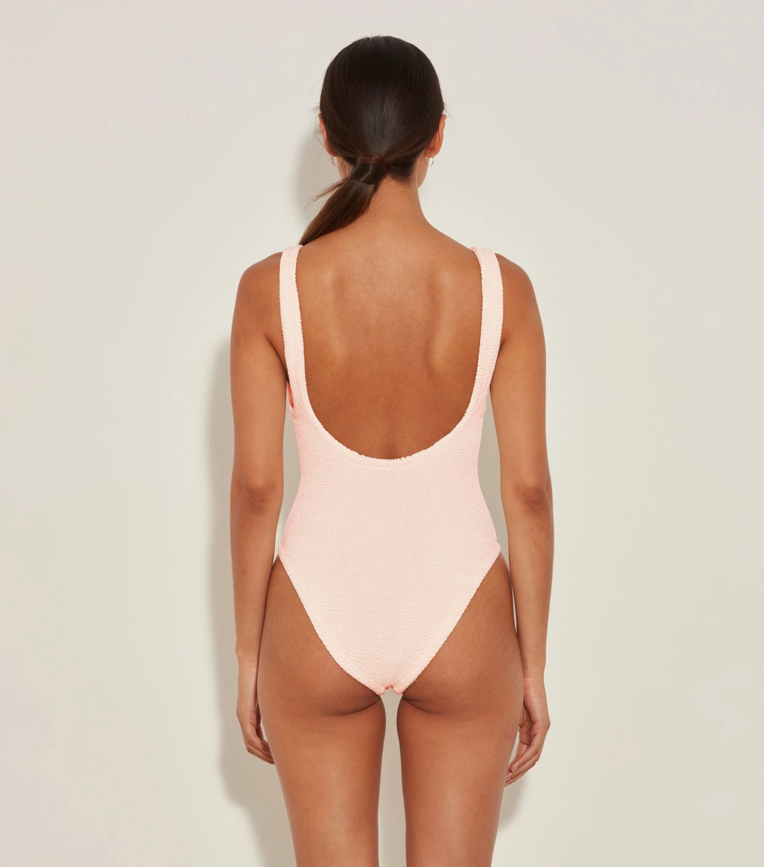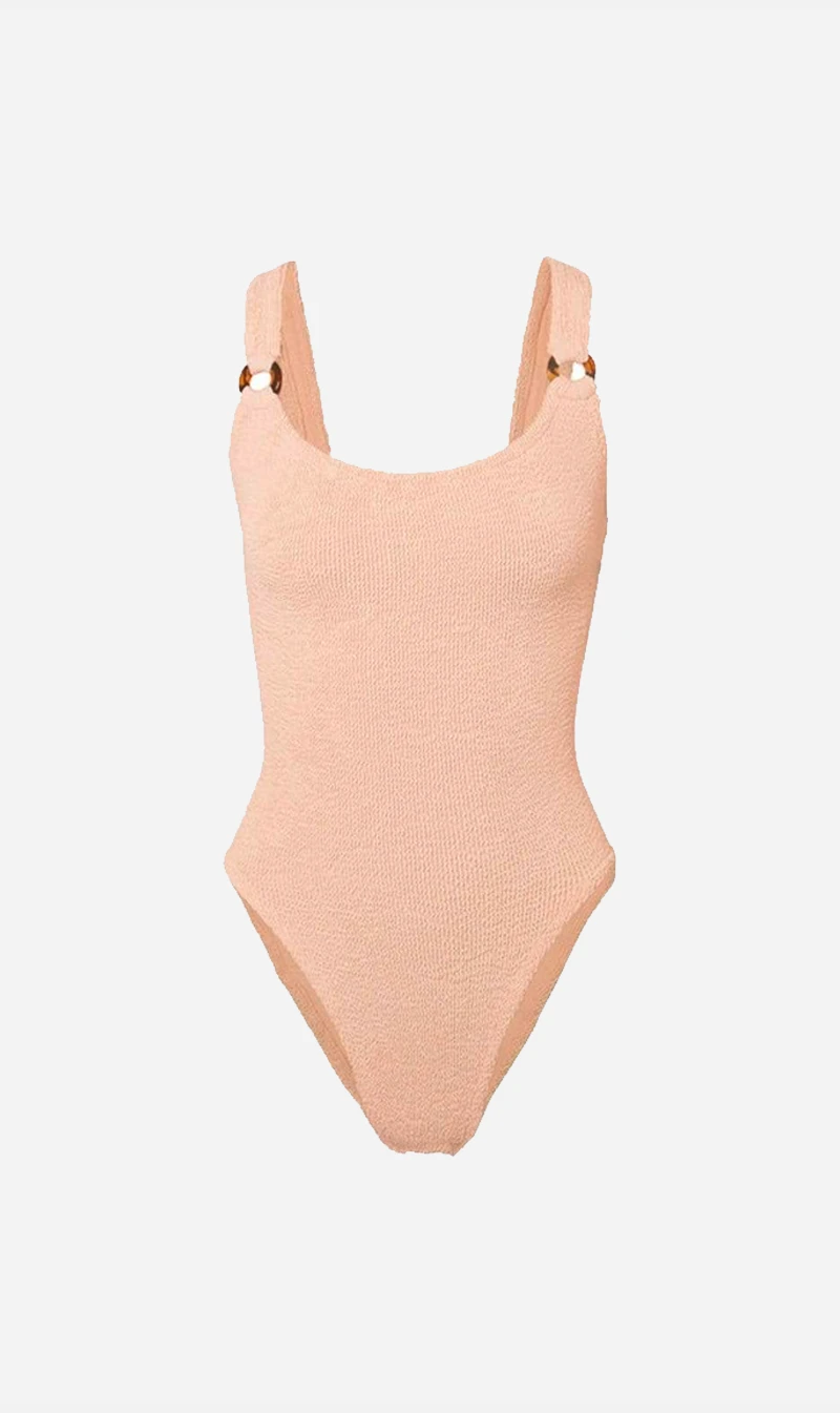 Some things never go out of style. Noughties tortoiseshell accents and a dipped neck silhouette and low scooped back make for the perfect summer silhouette in the same of the Domino Swim by Hunza G. A signature One Size Fits All style, the Domino has a round neck, scooped back and is finished with tortoiseshell colours rings on the shoulder straps.