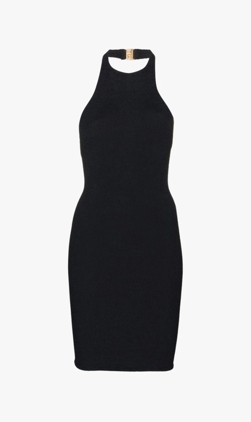The Hunza G Polly Dress in black is a body con fit with the signature Hunza G’s crinkle fabric.