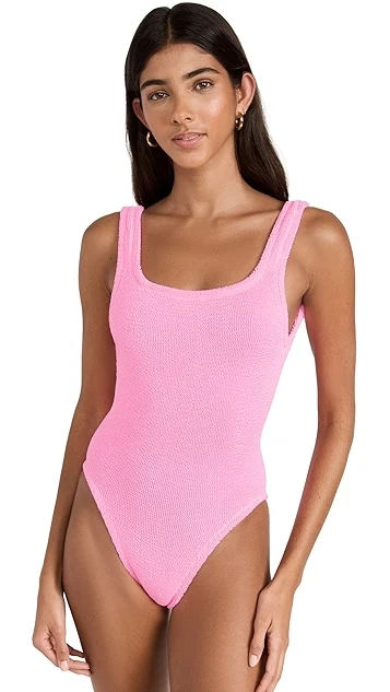 A Hunza G swimsuit in a popping pink hue, featuring allover smocking while a square neckline updates a sporty silhouette.