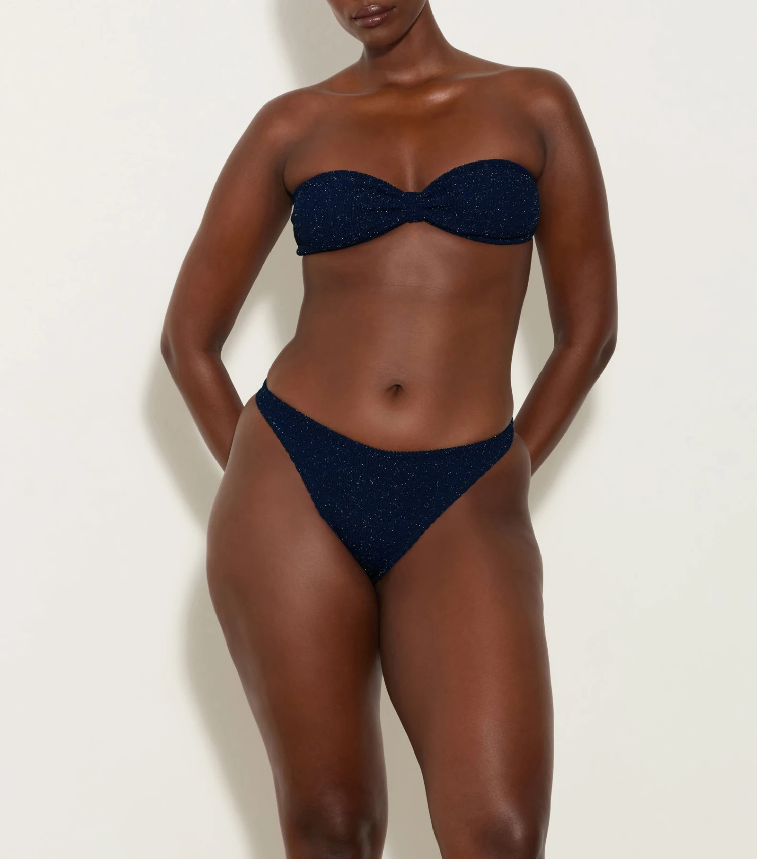 Bandeaus aren’t just for small busts. The Jean Bikini has the coverage you need without compromising on strap-free style. Newly reimagined with lurex fabric for a glittery update.