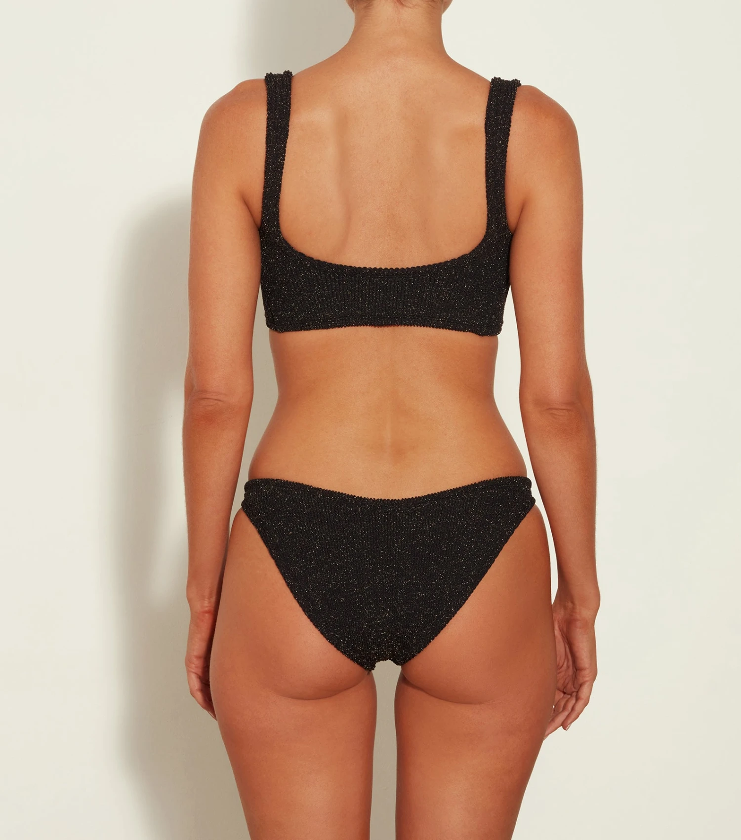 Support and style meet with Juno’s twist detail top and classic coverage bikini bottoms that can be worn high or low on the hip. Newly reimagined with lurex fabric for a glittery update.