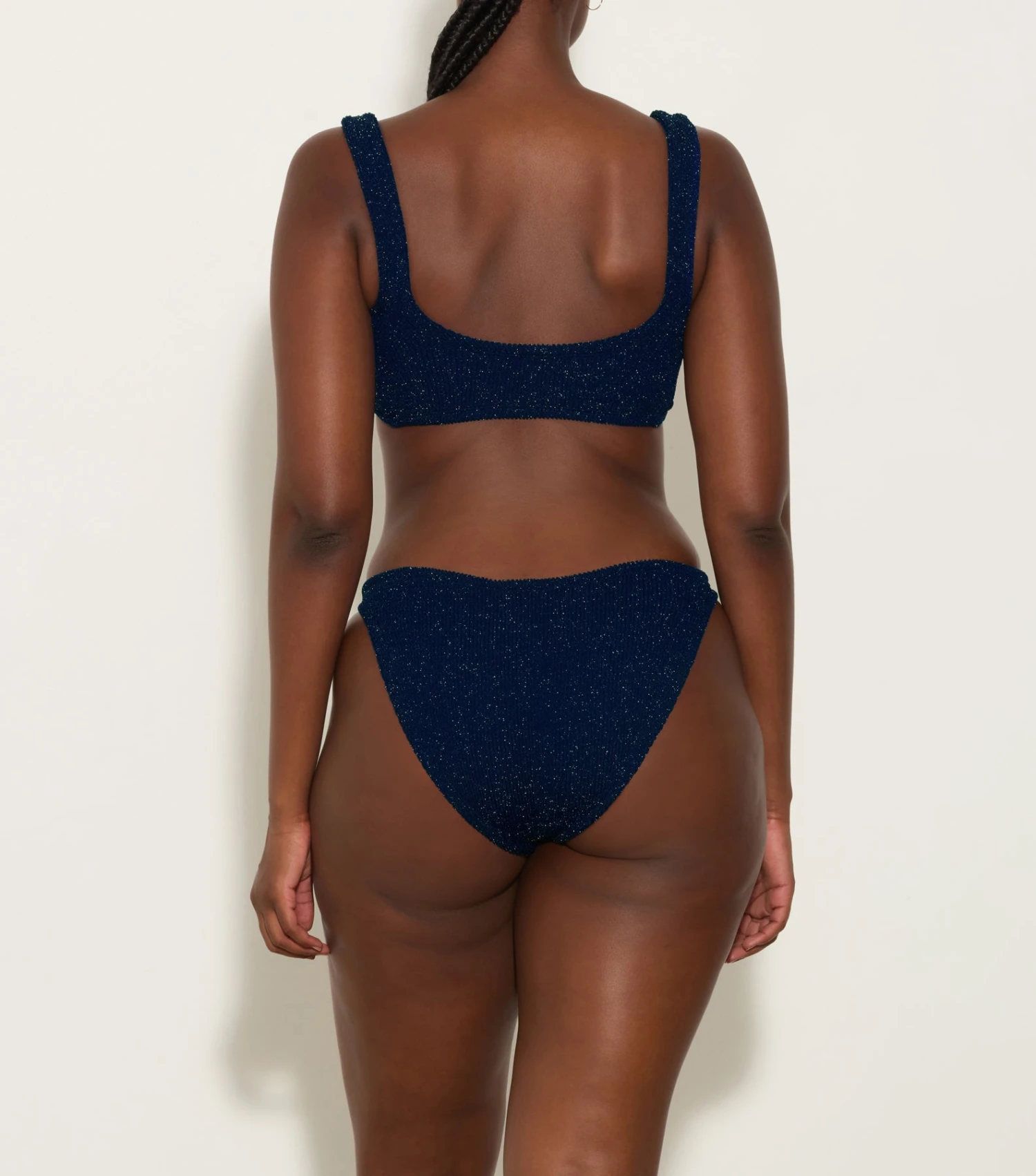 Support and style meet with Juno’s twist detail top and classic coverage bikini bottoms that can be worn high or low on the hip. Newly reimagined with lurex fabric for a glittery update.