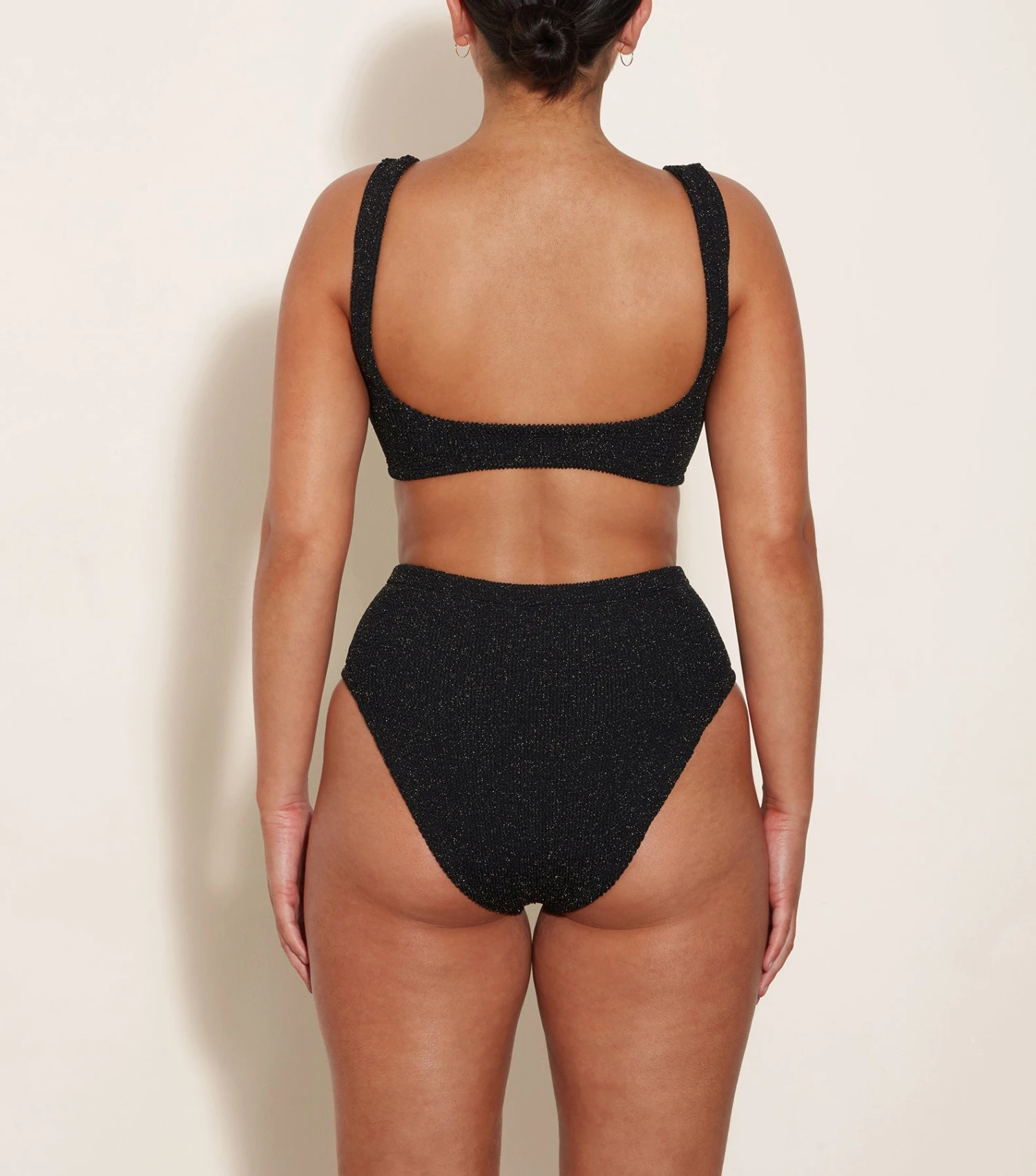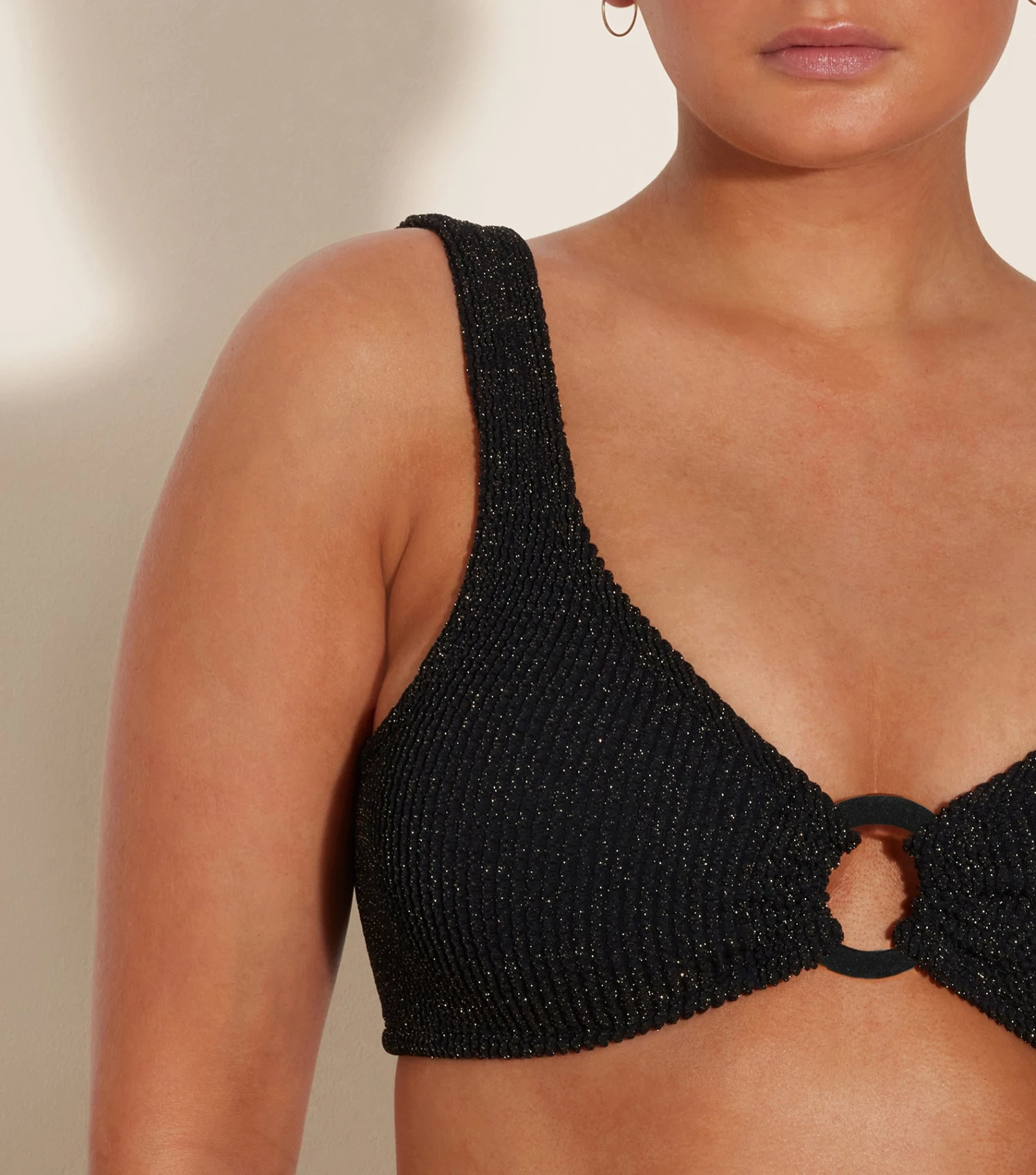 She’s got it all. Nadine’s high waisted bikini bottoms and tonal hoop detailing have comfort with a serving of understated glamour. Newly reimagined with lurex for a glittery update.