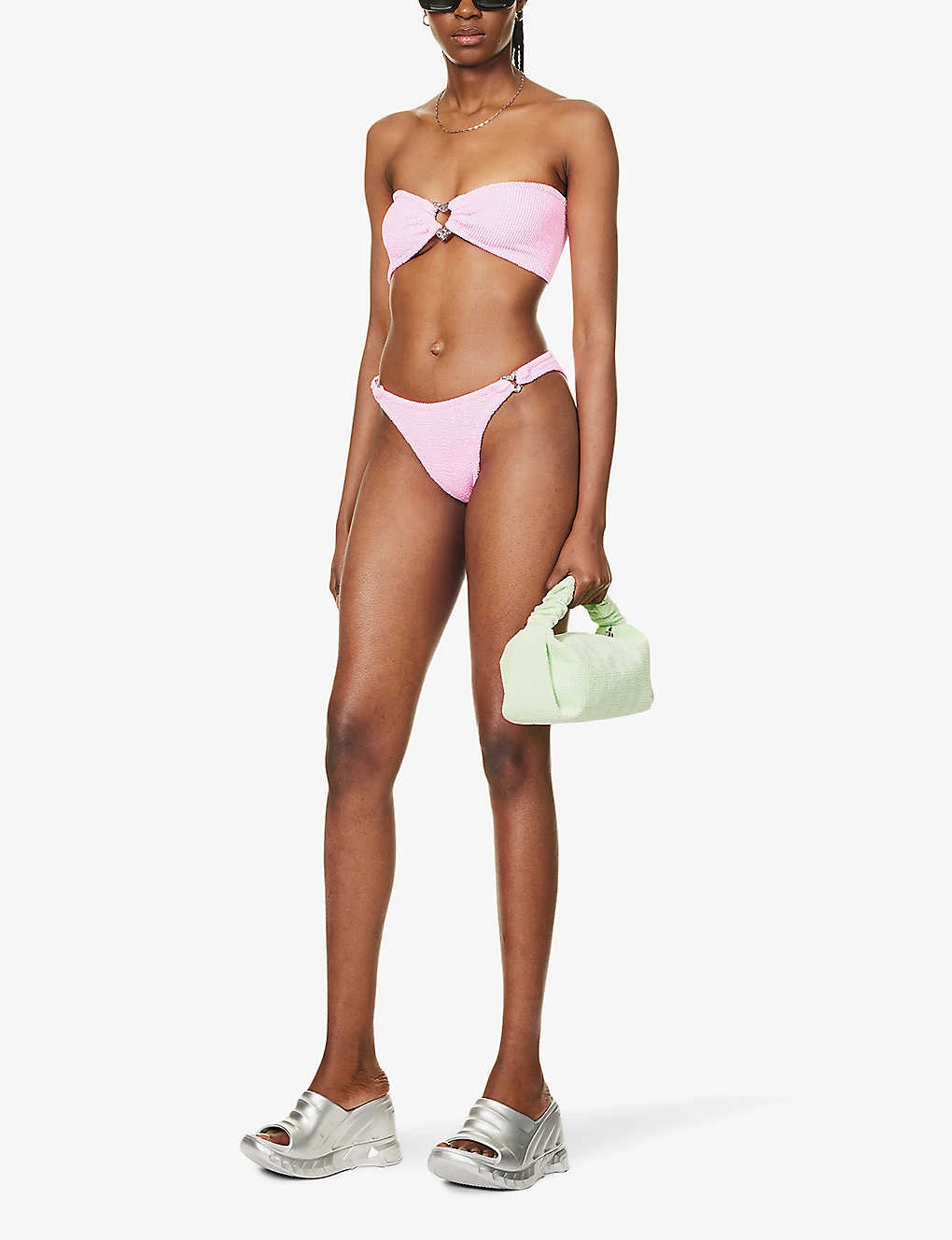 - Regular-fit, high-rise, elasticated waistband, glitter heart plaques at sides, all-over crinkled weave, high leg, full-coverage at back